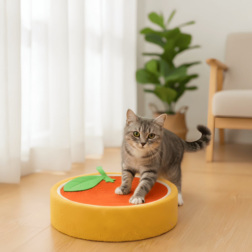 CitrusClaw Pad orange shaped cat scratching cushion is designed to support healthy claw maintenance while providing cats with a fun, safe indoor scratching space. The round scratch friendly surface encourages natural scratching instincts, helping reduce unwanted clawing on furniture, carpets, and household surfaces.