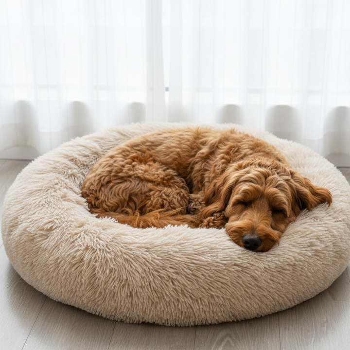 This plush donut dog bed features a round, padded design with raised outer walls that create a cozy lounging surface for everyday indoor use. The soft faux fur exterior provides a comfortable texture, while the circular shape encourages curling and relaxed resting positions.
