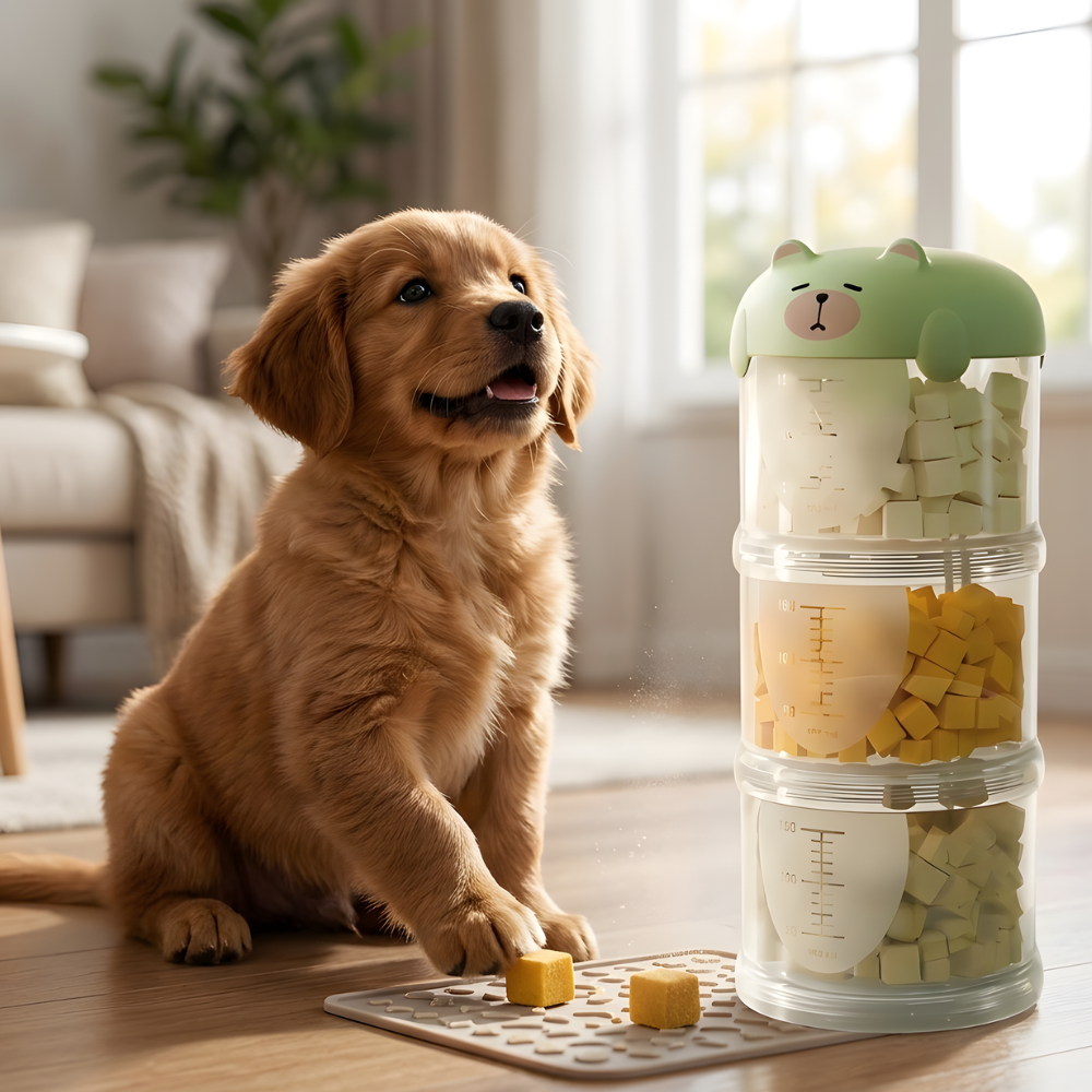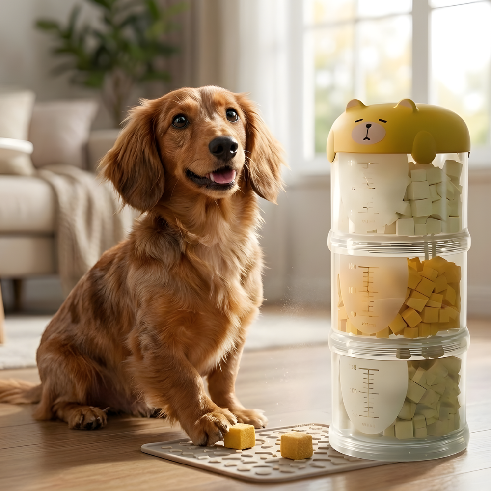 The portable pet treat dispenser is designed to organize and store dry snacks in separate stackable compartments for convenient home and travel use. Its layered structure allows portion separation, helping keep treats sorted and easily accessible throughout the day.